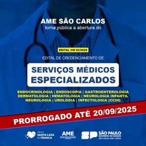 Edital CM 02/2025 – Credenciamento Médico AME São CarlosPor João Vitor Queiroz / 10 de junho de 2025 Leia o edital aqui. Veja o edital da 1ªprorrogação aqui. Veja o edital da 2ª prorrogação aqui. Veja o edital da 3ª prorrogação aqui.