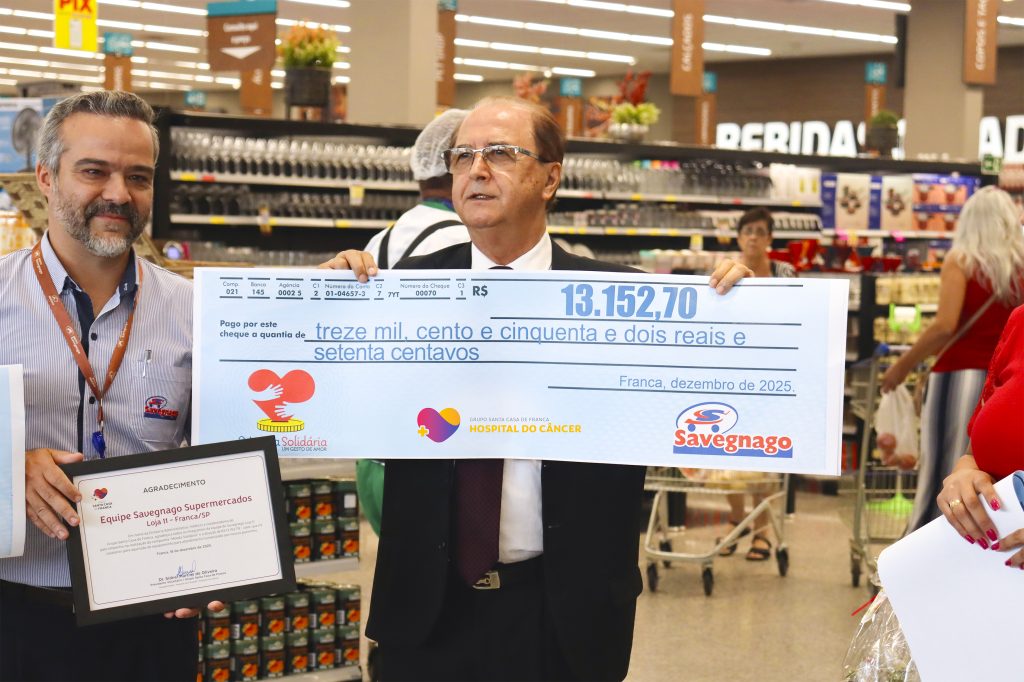 Na ocasião, o presidente do Grupo Santa Casa de Franca, Dr. Sidnei Martins de Oliveira, recebeu das mãos do gerente da Loja 11 do Savegnago Franca, Tales, o cheque simbólico no valor de R$ 13.152,70. O recurso será integralmente destinado à aquisição de equipamentos para o tratamento dos pacientes do Hospital do Câncer, unidade oncológica do Grupo Santa Casa de Franca.