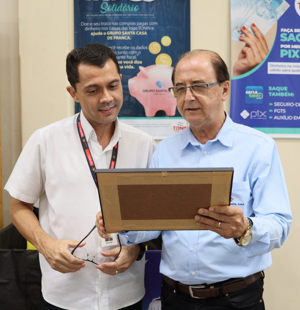 O momento da entrega contou com a presença do Dr. Sidnei Martins de Oliveira, vice-presidente do Grupo Santa Casa de Franca; do Sr. Edvar dos Santos, gerente da unidade do Tonin Superatacado da Avenida Champagnat; e da Sra. Edivânia Moura Silveira, responsável pelo Departamento Pessoal da loja.