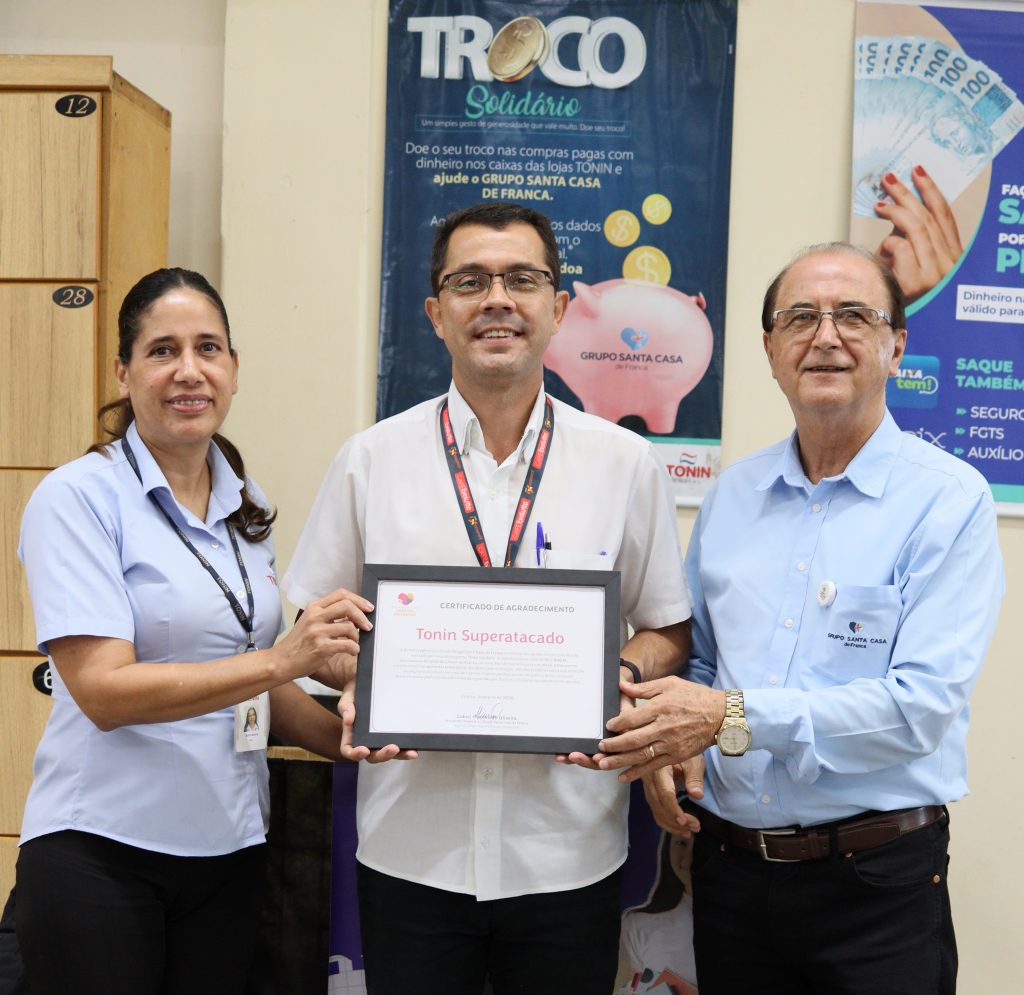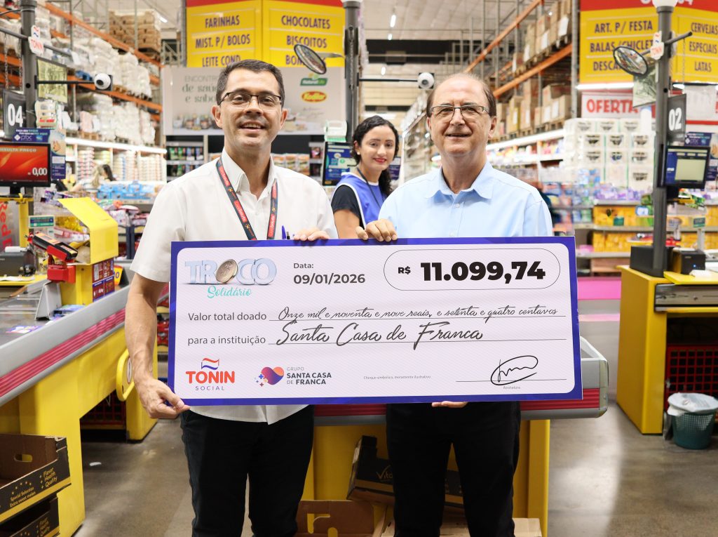 A solidariedade da comunidade francana e o compromisso social do comércio local se unem, mais uma vez, em apoio à saúde. Na última quarta-feira, 4 de fevereiro, o Tonin Superatacado realizou a entrega simbólica do cheque da Campanha Troco Solidário, iniciativa que arrecada doações dos clientes para instituições beneficentes. O Grupo Santa Casa de Franca, foi uma das entidades beneficiadas e recebeu o valor de R$ 11.099,74.